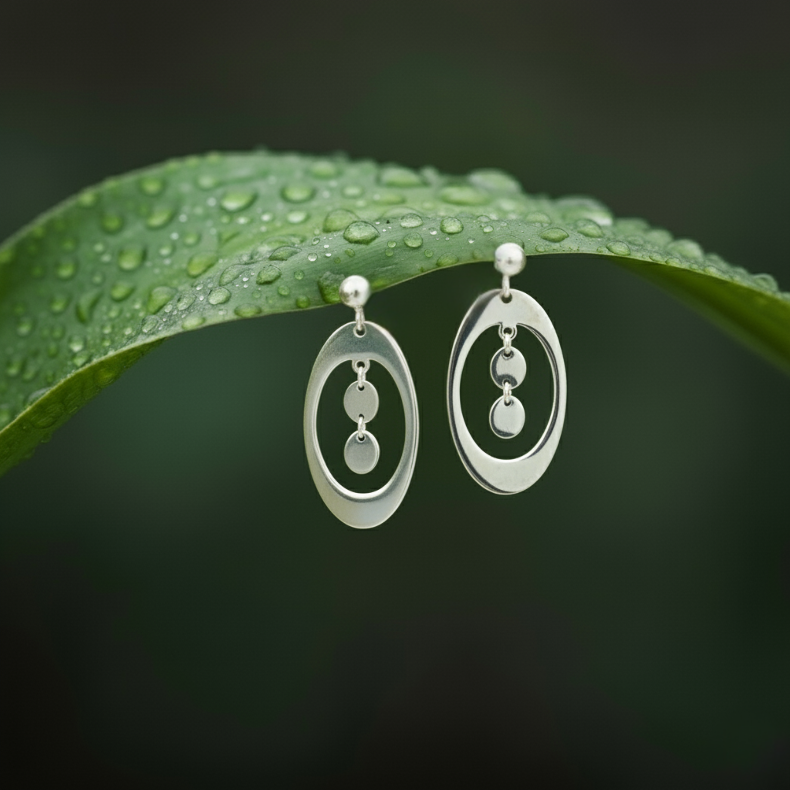 The design features a bold, open oval framework, creating a clean, architectural silhouette. This frame serves as the foundation for the unique internal motion. Within the oval, two smaller, polished silver discs hang freely. They are connected by a subtle link, allowing them to swing and reflect light independently, visually mimicking the graceful, cascading movement of water drops.